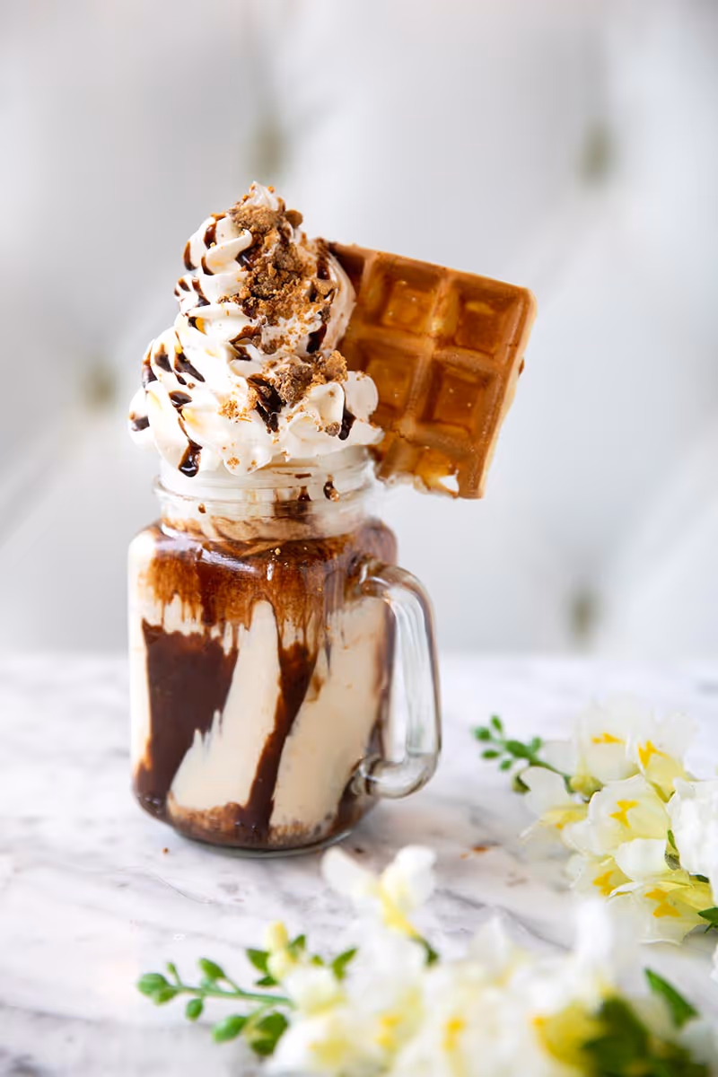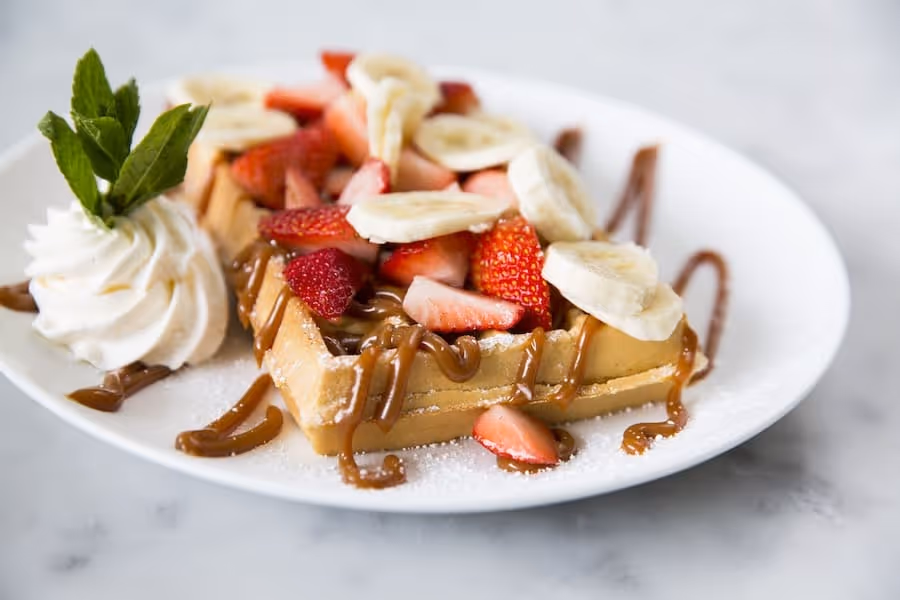 Cookie butter, sweet cream cheese, strawberries, coulis, & white chocolate chip morsels.