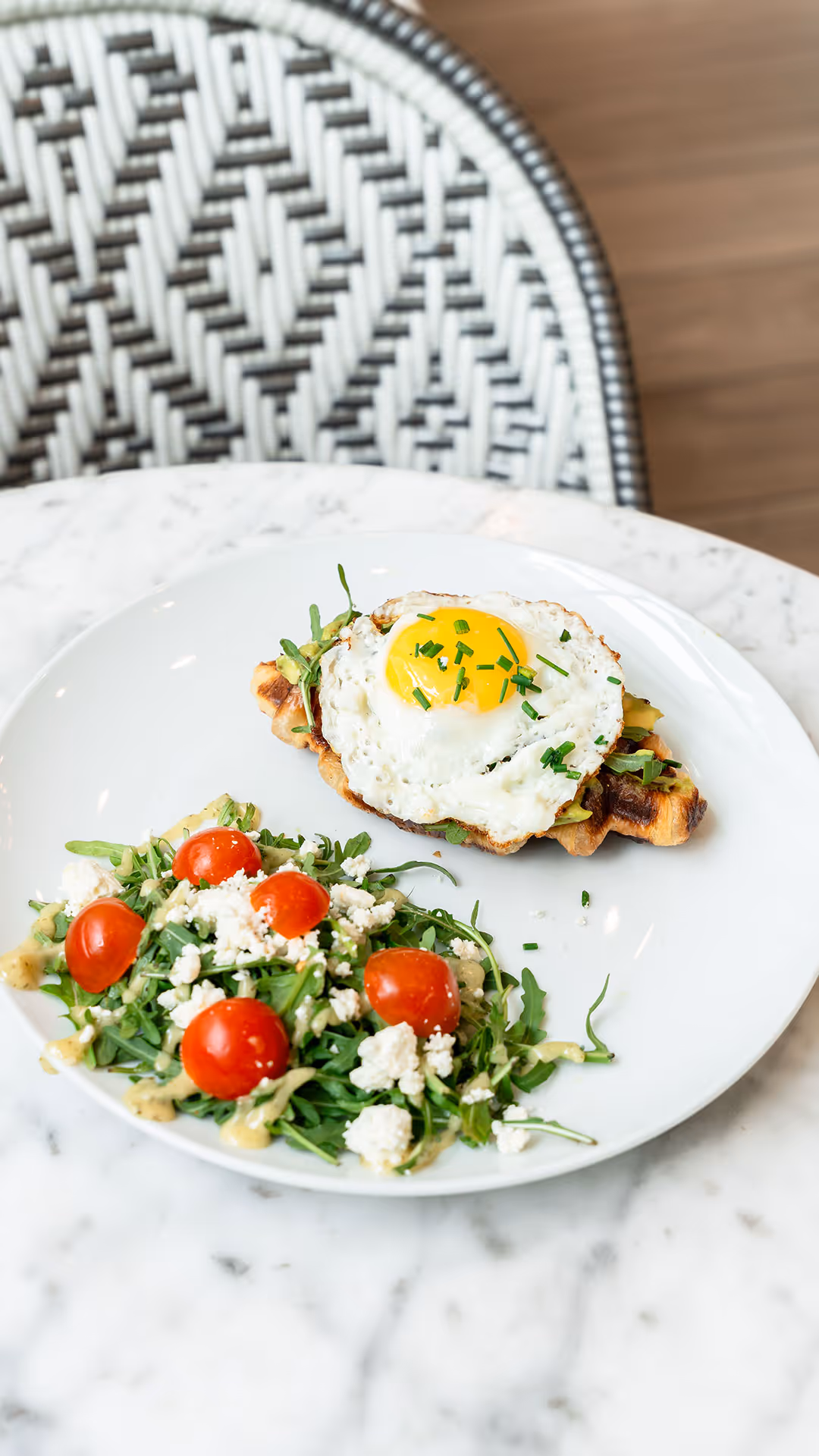 Croissant, fresh avocado, one egg any style & arugula salad.