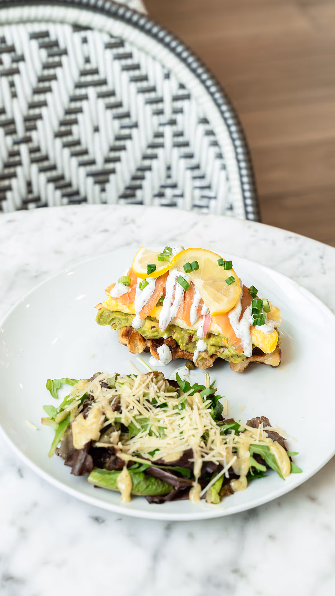 Croissant, fresh avocado, hot aioli, feta, one egg any style, crispy bacon & arugula salad.